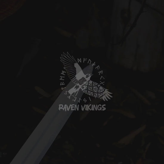• Hand-forged high-carbon steel blade with aged finish and etched fantasy symbols